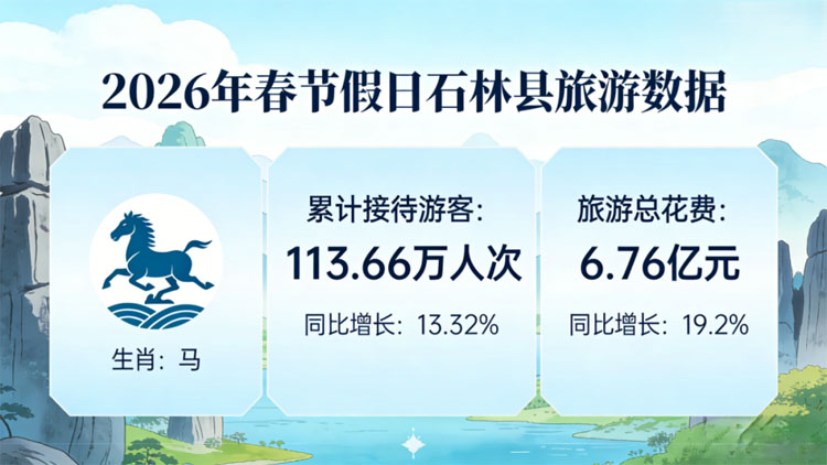 据统计,春节假日期间,全县累计接待游客113.66万人次,同比增长13.32%;实现旅游总花费6.76亿元,同比增长19.2%。