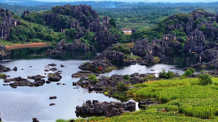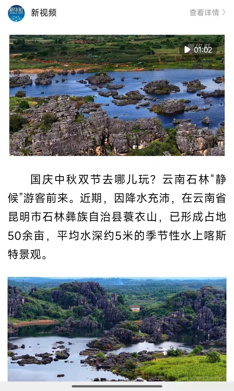 国庆中秋双节去哪儿玩?云南石林“静候”游客前来。近期,因降水充沛,在云南省昆明市石林彝族自治县蓑衣山,已形成占地50余亩,平均水深约5米的季节性水上喀斯特景观。