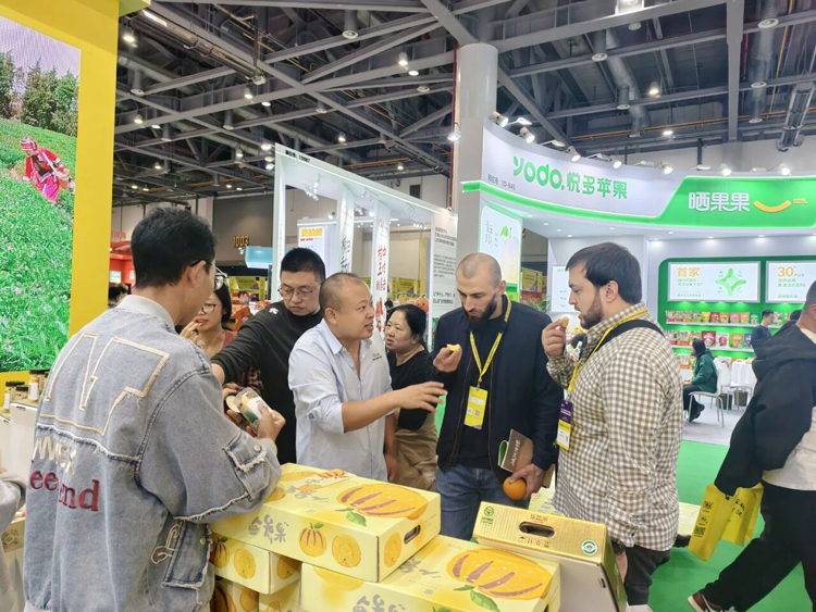 “第一次吃到这么清甜的人参果,不像以前买的发涩,水分特别足!”一位杭州客商刚尝完一块切好的人参果,就拉着同伴围到咨询台。展位试吃区前人群络绎不绝,工作人员一边递上果叉,一边介绍:“我们石林的人参果生长在高海拔喀斯特山区,昼夜温差大,糖分积累足,又是自然成熟,吃起来不仅水分足,加工后的果干甜度也高。”不少客商驻足咨询、扫码留资,更有来自各地的采购商围绕产品品质、供应能力等细节深入洽谈,现场交流氛围热烈。